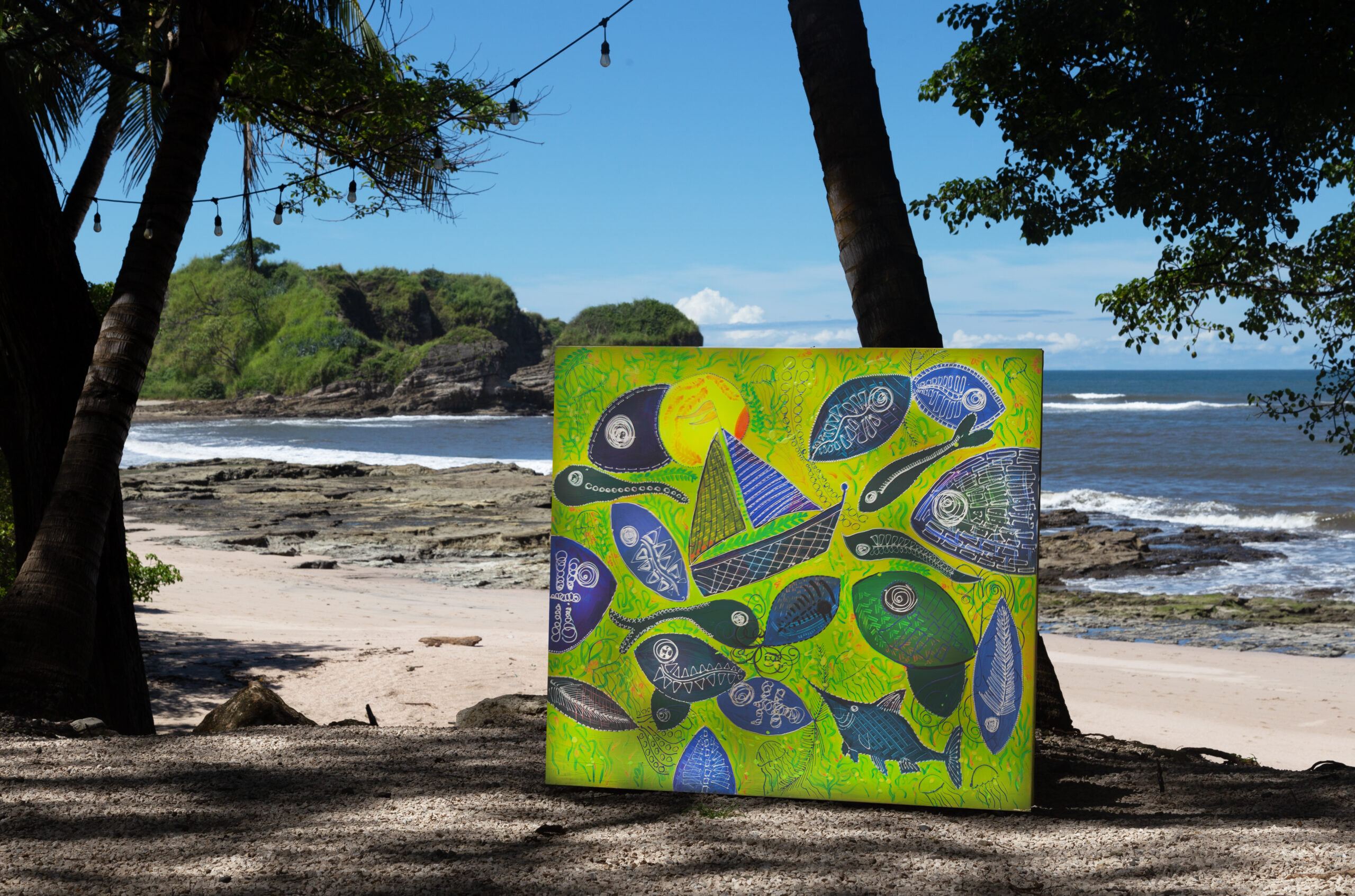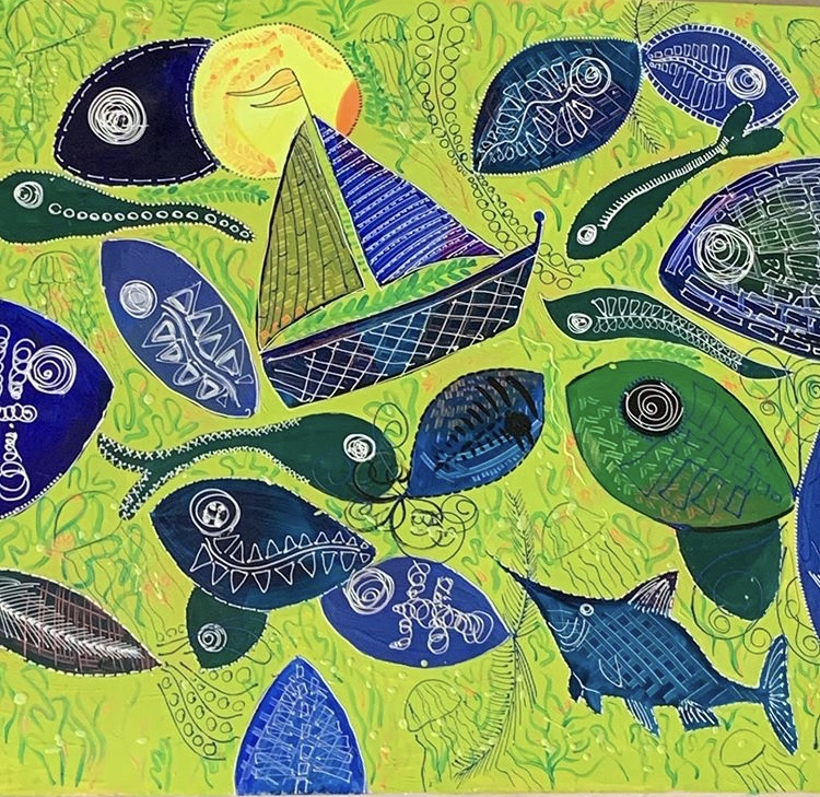 Surrounding the boat, an ecosystem of organic forms unfolds. Fish-like figures, abstract yet alive, move through a vibrant sea of greens, blues, and electric yellows. These beings feel symbolic—like souls, memories, or passing thoughts—each one carrying its own language of lines, textures, and markings. They accompany the boat without interfering, as if witnessing the journey from different dimensions of existence.