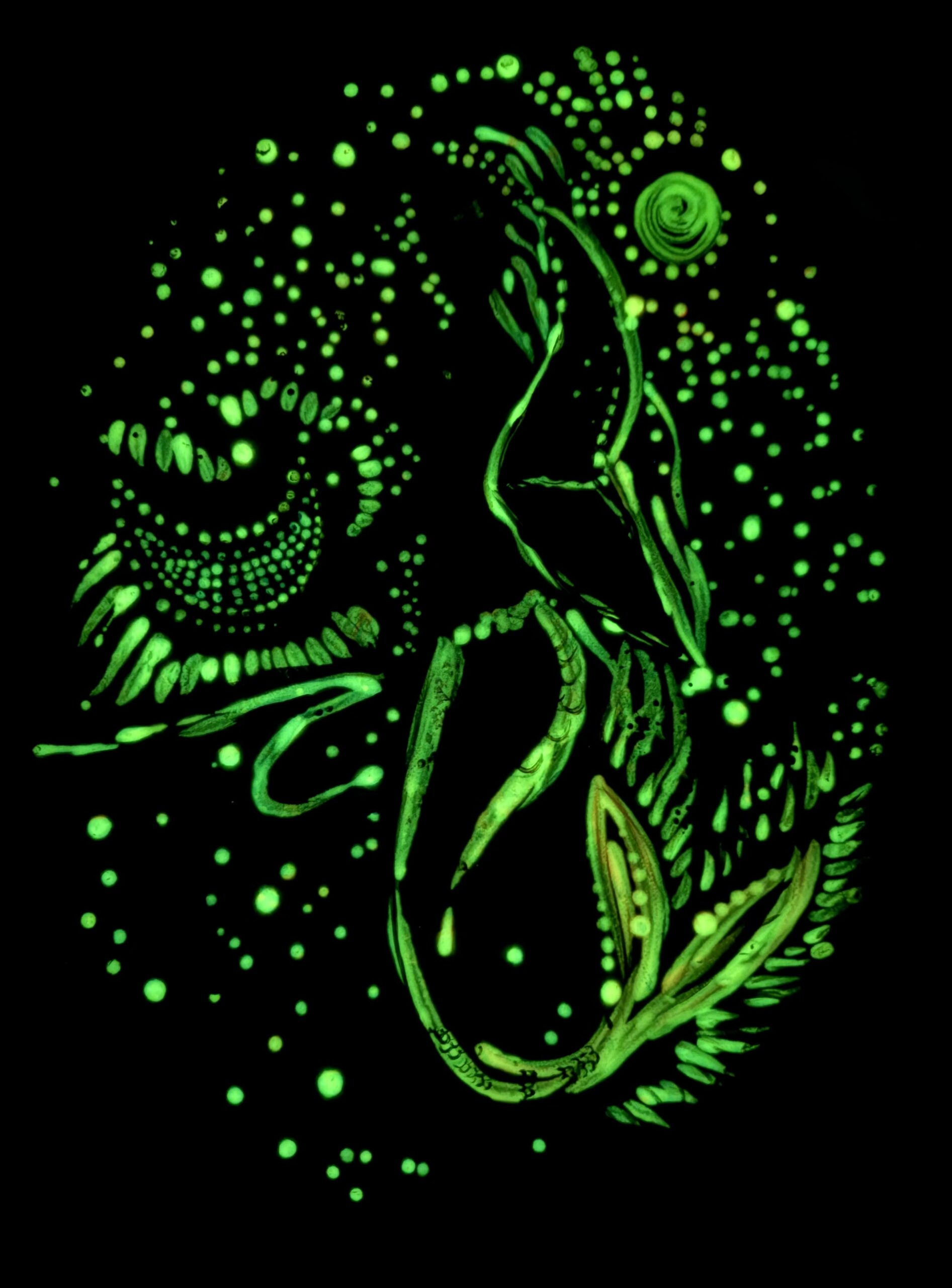 There is a quiet strength in her presence. She is not loud, yet she is undeniable. Her energy feels ancient, as if she has always existed in the depths of the ocean and within the unseen layers of the universe. The details surrounding her—textures, colors, and organic patterns—create a sense of movement between worlds: water and sky, day and night, seen and unseen.