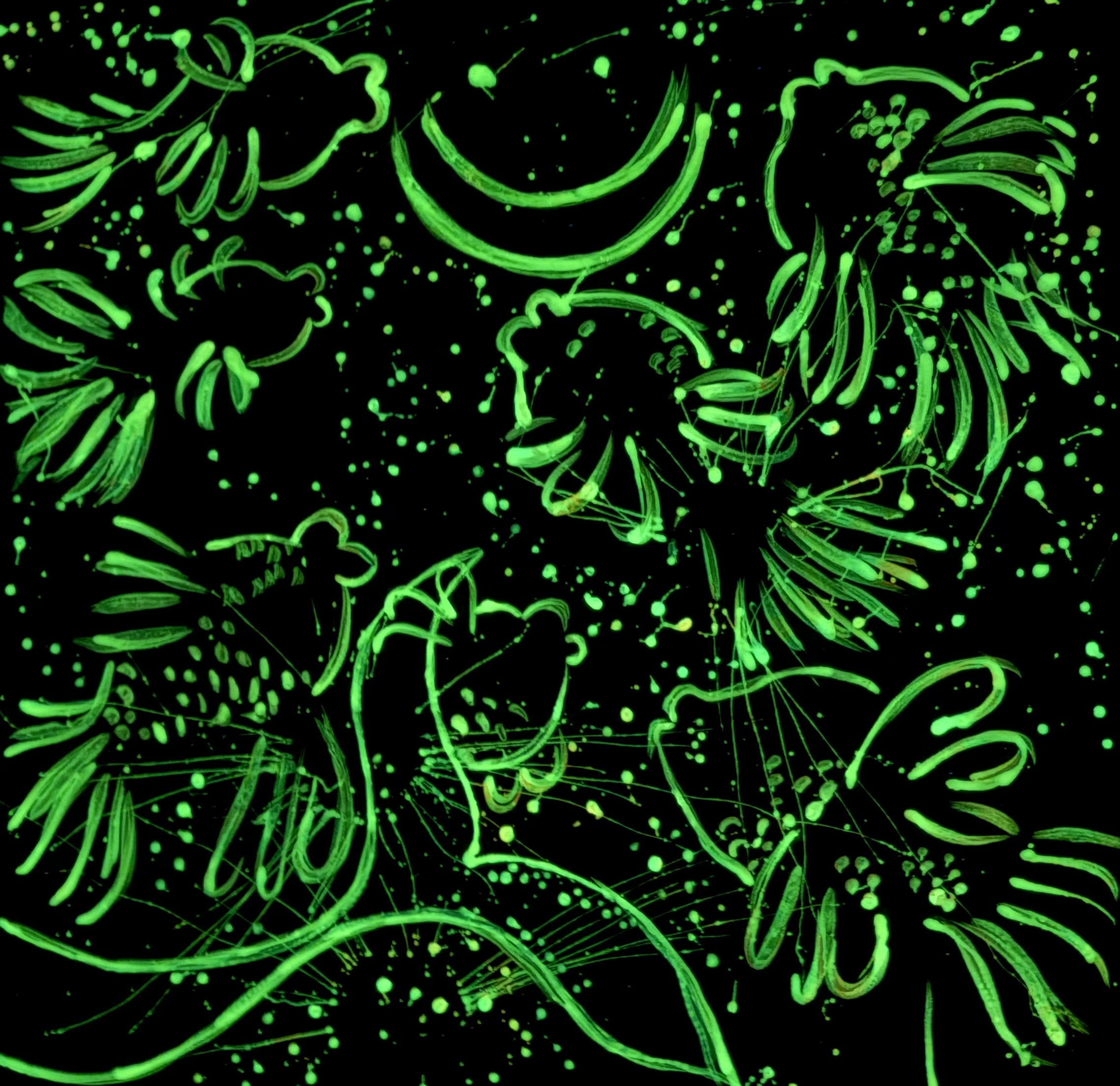The glow-in-the-dark element holds a deeply intimate meaning. It evokes those small lights—like fireflies—that appeared during the most difficult moments of my life, when it was hard to believe in myself and in my art. Those lights were not overwhelming, they did not illuminate everything, but they were enough to remind me that hope still existed. That something within me was still alive, still creating, still insisting. This transforms the piece into a dual experience: by day it is color, texture, and movement; by night, it becomes memory, inner light, and resilience.