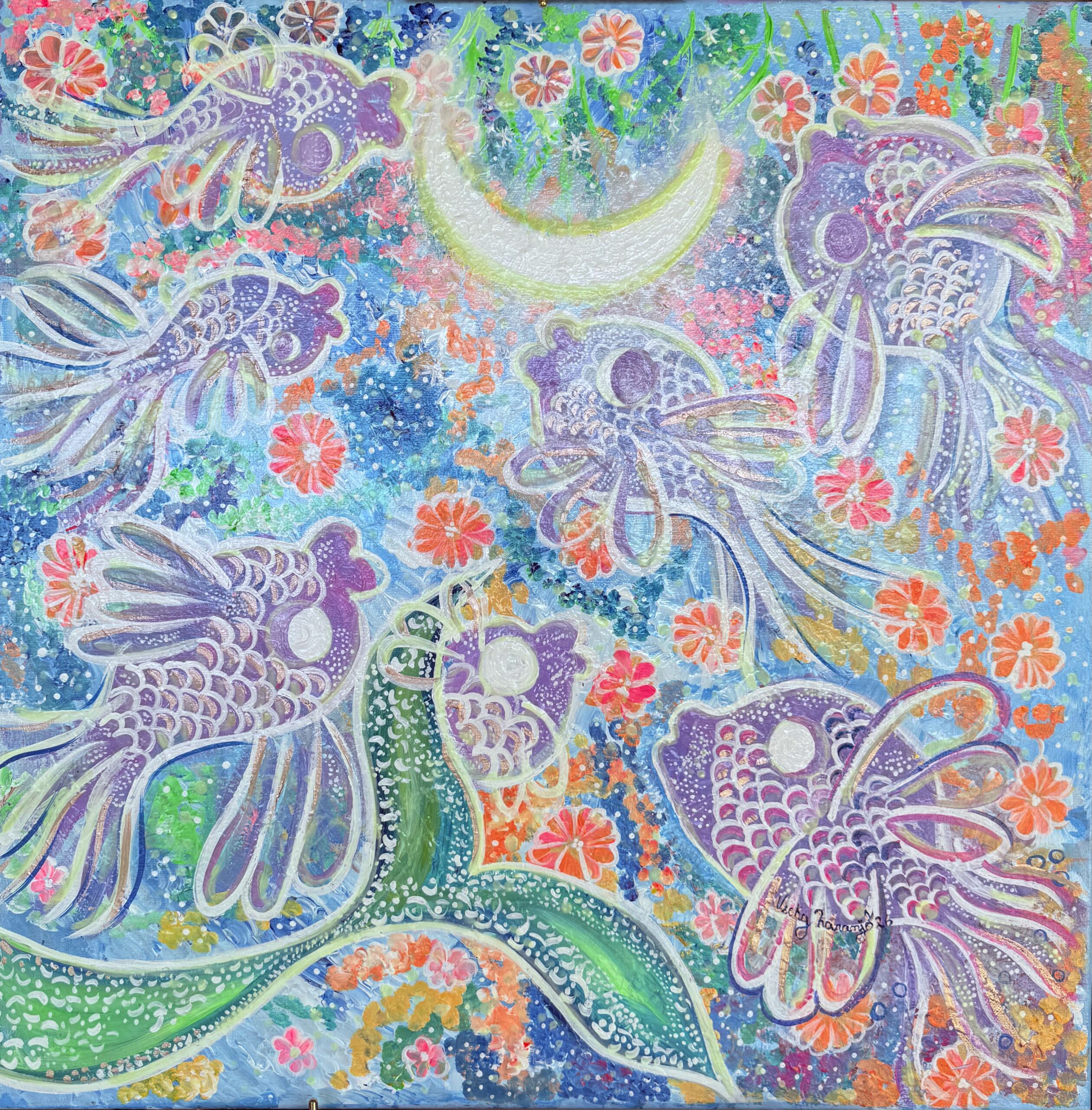 In this painting, we are all fish. We share the same space, floating beneath a moon that silently watches us—witness to our emotions, our inner struggles, and our encounters with one another. Each figure swims in harmony with the others, reminding us that coexistence is a delicate act: moving forward without hurting, existing together without invading, learning to flow as one even when each of us carries our own rhythm and story. It is a metaphor for life, for society, for the human connections that both sustain and challenge us.
